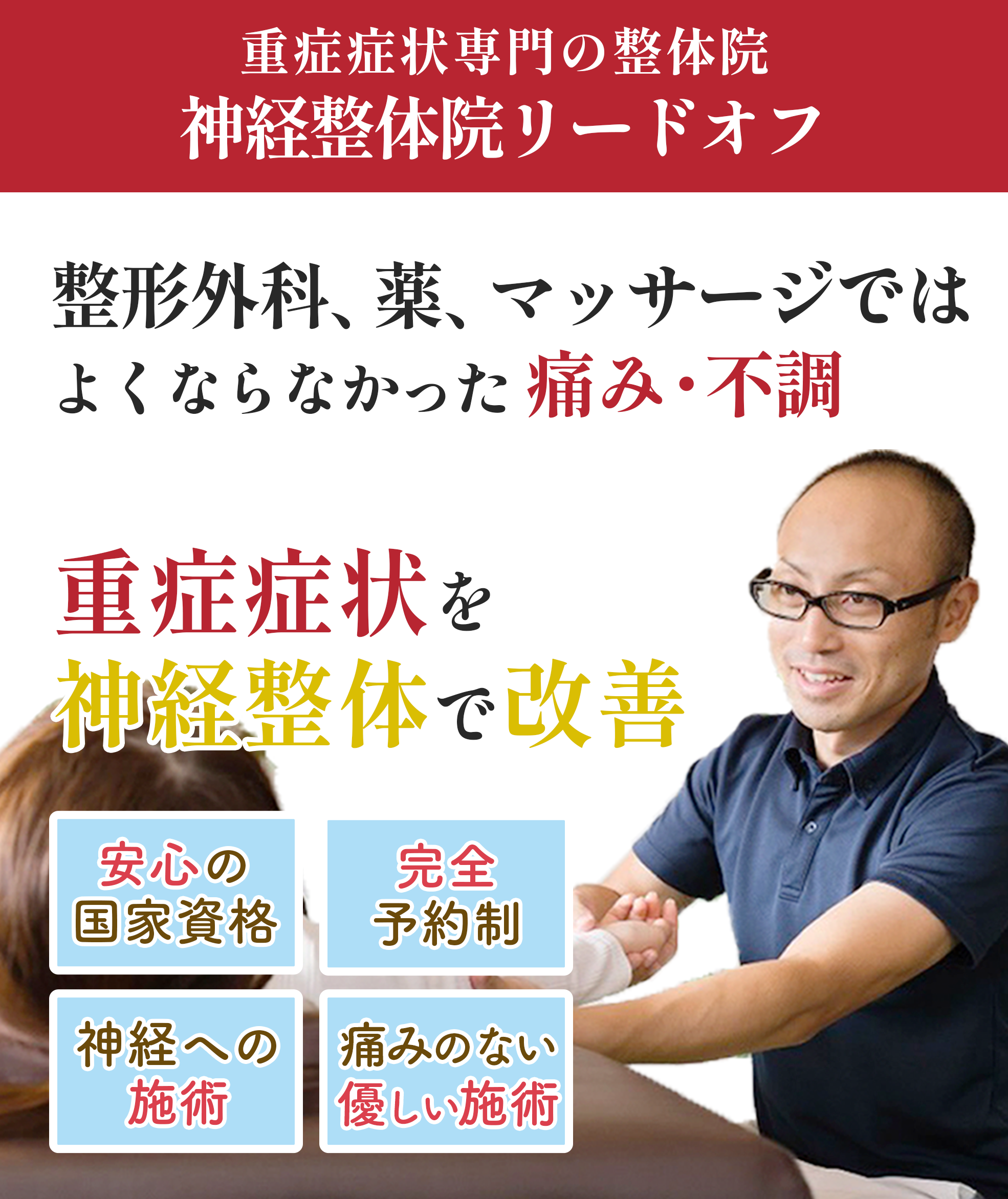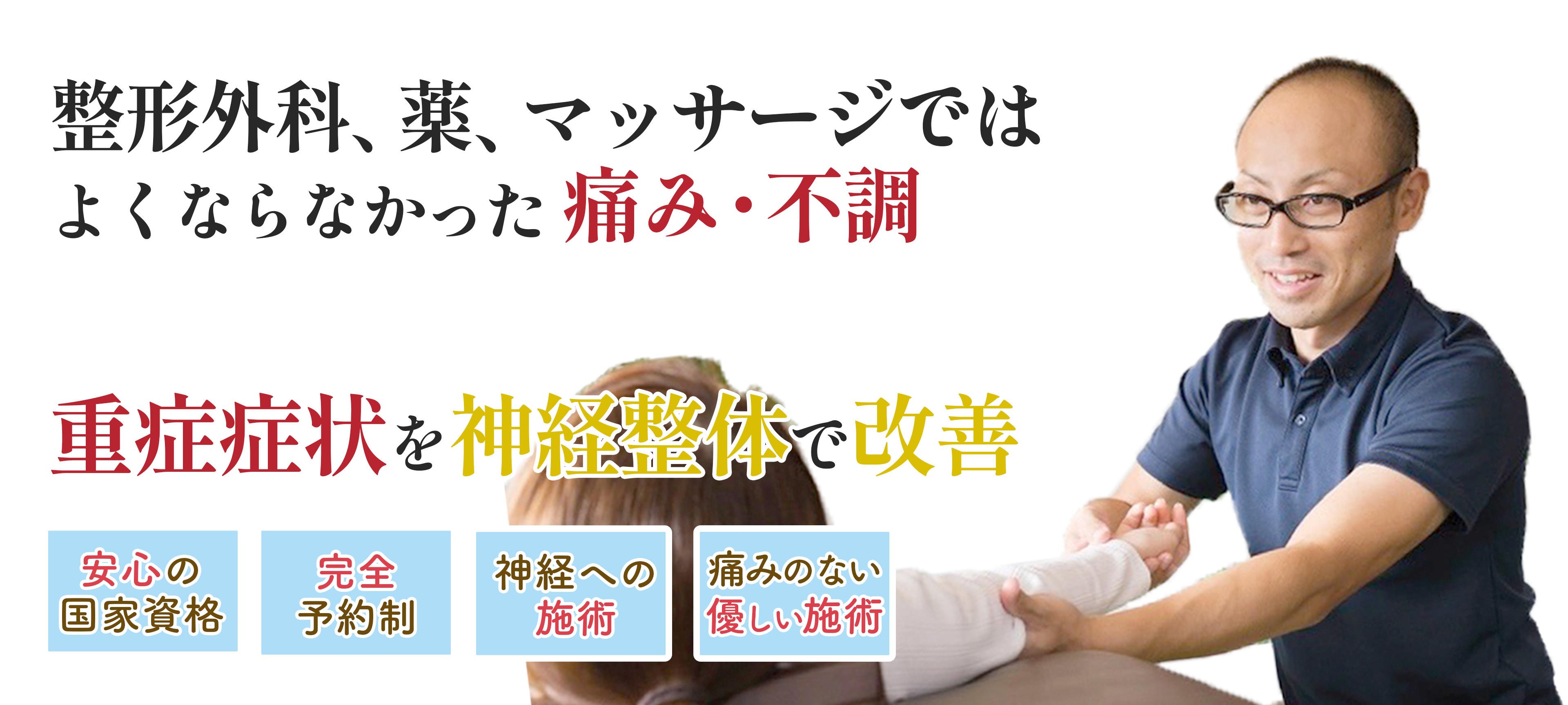 ※上記に記載していない疾患や原因不明と言われた症状でも改善症例はございますので、一度ご相談頂ければと思います。 ※上記の例は、実際に神経整体で体のお悩みを解消された方の個々人の症状です。 ※効果を保証するものではありません。 お身体のお悩みを解消するためにかかる時間は、症状や個人によって異なります。 一度お身体を診させていただいてから、それぞれの方に合ったプランを提案させていただきます。実際に神経整体で
